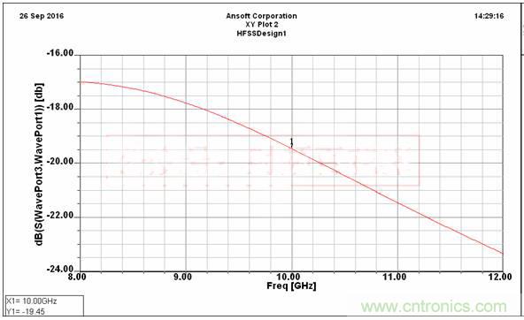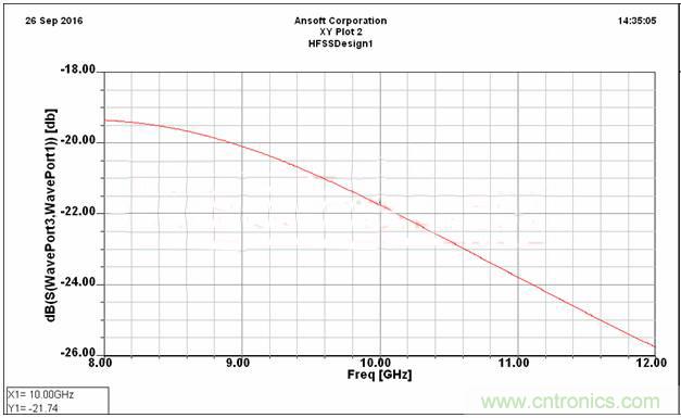 添加的C形環(huán)受到相同的磁場耦合,產(chǎn)生與主線相反的電流,從而對(duì)主線進(jìn)行二次耦合,增強(qiáng)了主線的耦合度。仿真了1mm耦合間距的耦合度,仿真結(jié)果如下圖4所示。在10GHz耦合-18.72dB,x波段耦合度-17.25~-19.27dB,波動(dòng)2dB左右。
