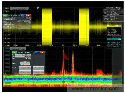 很多用慣了示波器的人都喜歡示波器的觸發(fā)功能,用各種觸發(fā)方式來隔離各種事件,穩(wěn)定顯示,觀察異常。在傳統(tǒng)頻譜儀上是很難實現(xiàn)觸發(fā)的,但是當(dāng)我們發(fā)現(xiàn)示波器的模板觸發(fā)方式,很容做到,把時域波形的實時頻譜變到頻域來觀察,借助MASK 測試的一些小工具,居然輕松設(shè)置和輕松觸發(fā)。因為模板的形狀自由編輯,觸發(fā)的動作自由組合,這樣的波形分析已經(jīng)完全跨越的時域和頻域的使用習(xí)慣,完全融合了時域和頻域?qū)π盘柕乃季S方法了。