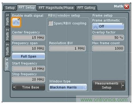 首先要把頻譜分析的速度提高上去,實時刷新,所以你看不再忍受示波器fft 變換時候類似死機一般,其次我們把RBW 做到了高達1Hz,這個水平幾乎只有頻譜儀才能做到啊,我們的界面設(shè)計和頻譜儀的操作一摸一樣,中心頻率,頻譜范圍,起始頻譜,截止頻率,RBW 設(shè)置,窗函數(shù)設(shè)置,把頻譜儀的設(shè)置幾乎全部移植過來了。下面從四個方面論證我們怎么把fft 功能做到極致的: