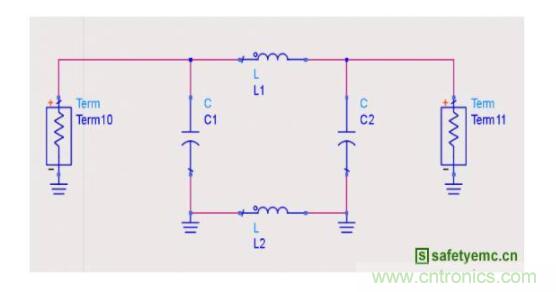 由于2.25GH大約是750MHz的三次諧波,因此我們首先針對750MHz做濾波設(shè)計。為了克服這種干擾應(yīng)該對基帶信號加以濾波,阻止高頻成分傳播和搬移。如圖8所示是一種推薦電路,其中電容C1、C2和L2可作為備選,將此電路加在圖6黃色框圖標示的電源入射端口附近做濾波。