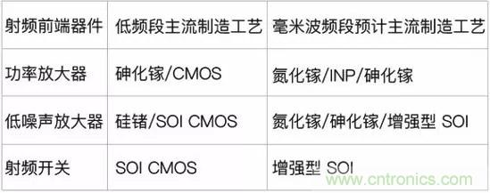 以功率放大器為例,目前主流的功率放大器制造材料為砷化鎵,但在毫米波頻段,氮化鎵及InP的制造工藝在性能指標(biāo)上均要強(qiáng)于砷化鎵。下表所示為從低頻到毫米波段主要的射頻前端器件制造工藝上的發(fā)展方向。