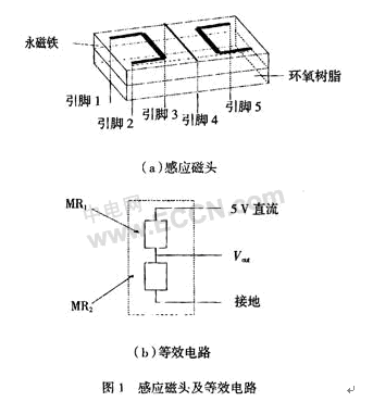 用銻化銦-銦共晶體薄膜磁阻元件制成MRCS的感應(yīng)磁頭(圖1)主要由導(dǎo)線、絕緣基片、InSb-In磁阻元件MR1和MR2、永磁體、5個(gè)引腳等組成,另外加上起屏蔽和保護(hù)作用的金屬外殼。MR1和MR2是相對放置的一對磁阻元件,其阻值大致相等,導(dǎo)線置于MR1和MR2的對稱軸位置。其等效電路如圖1(b)。