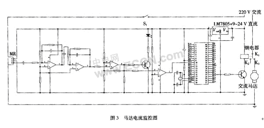 本文研制的電流傳感器已經(jīng)在馬達(dá)監(jiān)控方面獲得了實(shí)際應(yīng)用。眾所周知,馬達(dá)一旦被意外卡死而停轉(zhuǎn),電路中流過它的電流會(huì)遠(yuǎn)遠(yuǎn)高于正常工作的電流,而馬達(dá)長時(shí)間停轉(zhuǎn)的話,很容易被燒壞,本電流傳感器就是要感知馬達(dá)停轉(zhuǎn)的電流,從而把整個(gè)供電斷開,起到保護(hù)馬達(dá)的作用,其基本原理如圖3所示。