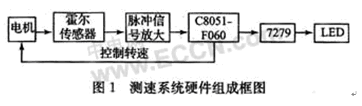 本系統(tǒng)采用單片機(jī)C8051F060作為主控制器,使用霍爾傳感器測量電機(jī)的轉(zhuǎn)速,通過7079最終在LED上顯示測試結(jié)果。此外,還可以根據(jù)需要調(diào)整控制電機(jī)的轉(zhuǎn)速,硬件組成由圖1所示。
