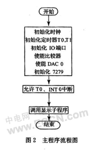 控制器C8051F060主要完成轉(zhuǎn)速脈沖的采集、16為定時計數(shù)器計數(shù)定時、運(yùn)算比較,片內(nèi)集成的12位DAC0控制轉(zhuǎn)速,并且通過7279顯示接口芯片實(shí)現(xiàn)數(shù)碼顯示等多項(xiàng)功能。系統(tǒng)采用外部晶振,系統(tǒng)時鐘SYSCLK等于18432000,T0定時1 ms,初始化時TH0=(-SYSCLK/1 000)》8;TL0=-SYSCLK/1 000。等待1 s到,輸出轉(zhuǎn)速脈沖個數(shù)N,計算電機(jī)轉(zhuǎn)速值。將1 s內(nèi)的轉(zhuǎn)速值換算成1 min內(nèi)的電機(jī)轉(zhuǎn)速值,并在LED上輸出測量結(jié)果。