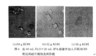 四棱錐和四棱臺(tái)的四個(gè)斜面對(duì)應(yīng)于腐蝕速率最低的(111)系列晶面。當(dāng)濃度較低時(shí),(100)和(111)晶面的腐蝕速率比小,所以出現(xiàn)小丘;當(dāng)濃度增大時(shí),(100)和(111)晶面的腐蝕速率比增大,所以出現(xiàn)小坑;濃度達(dá)到一定程度后,(100)和(111)晶面的腐蝕速率比趨于穩(wěn)定,依然出坑,而(110)和(111)晶面的腐蝕速率比增大,從而產(chǎn)生斜坡。只有調(diào)整KOH的濃度,得到匹配的(100)、(110)、(111)晶面的腐蝕速率,才能獲得較好的腐蝕表面。試驗(yàn)還表明,溫度主要影響腐蝕速率,對(duì)硅片腐蝕形貌影響不大。