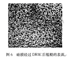 反應(yīng)離子深刻蝕(DRIE)能刻出非常深的垂直結(jié)構(gòu),本試驗(yàn)用于最后硅薄膜的形成。DRIE的刻蝕效果(刻深為250 μm)沒有KOH腐蝕的平坦,刻蝕表面比較粗糙,表面顆粒起伏為幾個(gè)微米,如圖6。此外刻蝕存在不均勻性,75 mm硅片四周已經(jīng)刻到電極露出,而硅片中央的電極還沒有露出。深刻蝕的不均勻性與刻蝕表面的圖形有著密切的聯(lián)系,但其中的成因和機(jī)理目前還沒有具體合理的理論和解釋說(shuō)明。因而無(wú)法從理論上指導(dǎo)規(guī)劃刻蝕表面的形狀設(shè)計(jì),更多的是依靠經(jīng)驗(yàn)手動(dòng)凋整。