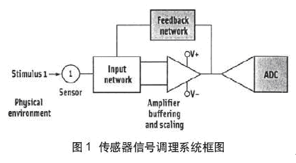 信號調(diào)理往往是把來自傳感器的模擬信號變換為用于數(shù)據(jù)采集、控制過程、執(zhí)行計算顯示讀出和其他目的的數(shù)字信號。模擬傳感器可測量很多物理量,如溫度、壓力、力、流量、運動、位置、PH、光強等。通常,傳感器信號不能直接轉(zhuǎn)換為數(shù)字?jǐn)?shù)據(jù),這是因為傳感器輸出是相當(dāng)小的電壓、電流或電阻變化,因此,在變換為數(shù)字?jǐn)?shù)據(jù)之前必須進(jìn)行調(diào)理。調(diào)理就是放大,緩沖或定標(biāo)模擬信號,使其適合于模/數(shù)轉(zhuǎn)換器(ADC)的輸入。然后,ADC對模擬信號進(jìn)行數(shù)字化,并把數(shù)字信號送到微控制器或其他數(shù)字器件,以便用于系統(tǒng)的數(shù)據(jù)處理(見圖1)。此鏈路工作的關(guān)鍵是選擇運放,運放要正確地接口被測的各種類型傳感器。然后,設(shè)計人員必須選擇ADC。ADC應(yīng)具有處理來自輸入電路信號的能力,并能產(chǎn)生滿足數(shù)據(jù)采集系統(tǒng)分辨率、精度和取樣率的數(shù)字輸出。