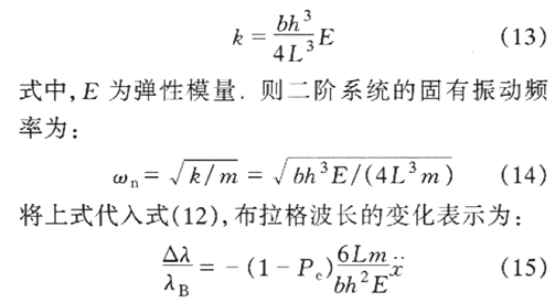 公式(1)為光纖光柵傳感器的應(yīng)變傳感機理光纖光柵加速度傳感器的設(shè)計是利用此機理來間接測量加速度物理量在傳感器的結(jié)構(gòu)設(shè)計上利用懸臂梁的受力把加速度量轉(zhuǎn)換為應(yīng)變量,從而轉(zhuǎn)化為布拉格波長的變化,通過檢測波長的變化即可實現(xiàn)加速度的測量.