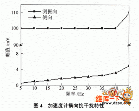 對單自由度的低頻光纖光柵加速度計來說,橫向抗干擾特性也是一項重要指標.實驗在加速度計的測振方向以及與其垂直的側(cè)向分別加0.5g的加速度,在5~45 Hz的頻帶范圍內(nèi)對兩個方向的振動值進行了對比,測量結(jié)果如圖4所示.從圖中可以看出,在加速度計的測振方向激振時加速度計測量輸出維持在100 mV 附近,而在與測振垂直方向激振時輸出在1~4mV范圍內(nèi),其橫向抗干擾能力達40 dB.可見此種設(shè)計方案可以有效降低橫向干擾的影響.
