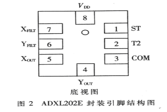 ADXL202的封裝形式為L(zhǎng)CC-8,其封裝和引腳的示意圖如圖2所示。