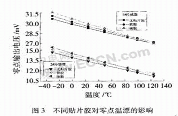 從圖3可以看出,貼片膠對傳感器零點(diǎn)的影響隨溫度變化而變化,在低溫時(shí),使用了硬膠貼片的傳感器的零點(diǎn)明顯高于使用軟膠與無膠的,這種差別隨著溫度的升高變得越來越小。這主要有三個(gè)原因:①貼片膠的彈性模量隨溫度的升高而變小;②貼片膠高溫固化,在低溫時(shí)會(huì)引起收縮殘余應(yīng)力;③貼片膠和芯片材料熱膨脹系數(shù)不同產(chǎn)生的熱應(yīng)力。特別需要注意的是,在85℃之后,硬膠的影響突然變小,小到幾乎與無膠的情況相同。這是因?yàn)橛材z的玻璃化溫度(Tg)為85℃,高于Tg點(diǎn)時(shí)膠的楊氏模量變小,因而對傳感器的零點(diǎn)溫漂影響變小。因此,在選用貼片膠時(shí),要求膠的Tg大于傳感器的工作溫度,以確保傳感器零點(diǎn)的穩(wěn)定性和工作的可靠性。