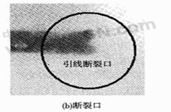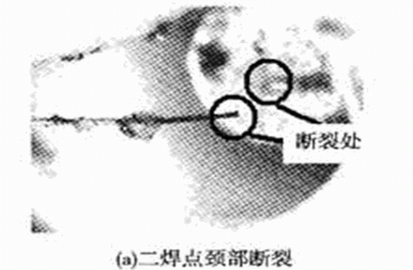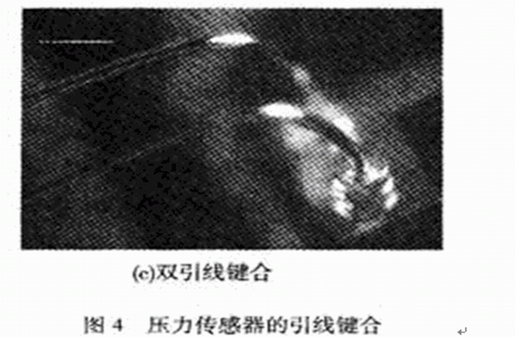 用于引線鍵合的鍵合線有Al線和Au線,由于Au線性能更優(yōu),所以壓力傳感器的鍵合工藝選用Au線。鍵合時(shí)要使鍵合面保持清沽,否則會(huì)影響鍵合強(qiáng)度,等離子清洗是一種能有效提高鍵合強(qiáng)度的方法。由于機(jī)油壓力傳感器工作環(huán)境惡劣,尤其是頻繁的振動(dòng)會(huì)導(dǎo)致金絲有缺陷的地方疲勞斷裂,或者最容易疲勞的位置如第二焊點(diǎn)附近的頸部位置發(fā)生斷裂,因此要求更高的鍵合質(zhì)量。曾對所研制的機(jī)油壓力傳感器進(jìn)行了臺(tái)架試驗(yàn),在一批試驗(yàn)樣品中經(jīng)過6×105次加壓和卸壓試驗(yàn)之后,發(fā)現(xiàn)有兩個(gè)樣品失效,故障分析結(jié)果表明:一個(gè)樣品的失效模式為信號(hào)處理電路上的一個(gè)電阻損壞;另一個(gè)樣品的失效模式為金絲線斷裂,如圖4(a),(b)所示。對于這種情況,可以采用雙金絲鍵合工藝,并盡量選用高純度、低缺陷的金絲,并做好引線鍵合前各封裝器件的清潔工作,如圖4(c)所示。這樣對金絲鍵合工藝進(jìn)行改進(jìn)后,在可靠性試驗(yàn)中,未曾出現(xiàn)金絲斷裂的質(zhì)量問題。