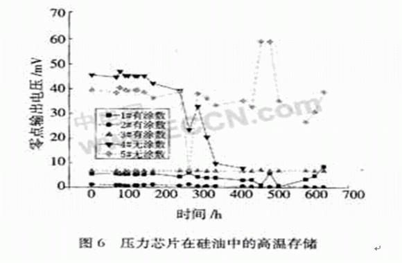 1#,2#,3#涂敷了保護(hù)層,4#,5#沒有涂敷保護(hù)層。可以看到,沒有保護(hù)層的傳感器在高溫下存儲(chǔ)了約200 h后,它的零點(diǎn)突然發(fā)生了變化,之后數(shù)據(jù)不穩(wěn)定;涂了保護(hù)層的壓力傳感器的零點(diǎn)在600多小時(shí)后仍然很穩(wěn)定。因此,為了防止硅油的污染導(dǎo)致壓力傳感器的失效,我們采取了一些必要的措施。首先,選擇高溫下盡可能穩(wěn)定的硅油;其次,盡量選擇具有良好鈍化層的芯片;最后,在不影響靈敏度的前提下,還可以在封裝過程中對芯片以及引線進(jìn)行涂敷鈍化層的處理。