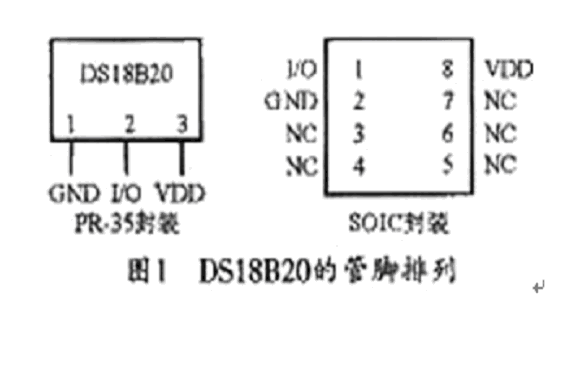DS18B20采用3腳PR-35封裝或8腳SOIC封裝,其管腳排列如圖1所示。圖中,GND為地;I/O為數(shù)據(jù)輸入/輸出端(即單線總線),該腳為漏極開路輸出,常態(tài)下呈高電平;VDD是外部+5 V電源端,不用時(shí)應(yīng)接地。