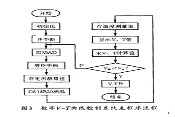 本系統(tǒng)程序主要包括主程序、讀出溫度子程序、溫度轉(zhuǎn)換命令子程序、計(jì)算溫度子程序、顯示數(shù)據(jù)刷新子程序等。編程時(shí)必須嚴(yán)格按照DS18B20的時(shí)序規(guī)定進(jìn)行。尤其需要注意的是,在多點(diǎn)溫度測(cè)量中,由于多個(gè)DS18B20掛在一條總線上,為識(shí)別不同的器件,在系統(tǒng)安裝之前,應(yīng)將主機(jī)逐個(gè)與DS18B20掛接,以讀出其序列號(hào)。具體是由主機(jī)先給DS18B20發(fā)一個(gè)復(fù)位脈沖,在DS18B20發(fā)回響應(yīng)脈沖給主機(jī)后,主機(jī)再發(fā)讀ROM命令(代碼33H),并發(fā)一個(gè)15μs左右的脈沖,接著再讀取DS18B20序列號(hào)的一位,并用同樣方法讀取序列號(hào)的每一位。其V-T曲線控制系統(tǒng)主程序和測(cè)溫子程序分別如圖3和圖4所示。