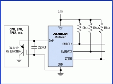 Maxim提供幾種專門設(shè)計用來精確測量熱二極管溫度并將其直接轉(zhuǎn)換成數(shù)字形式的IC。在這些IC中,其中一些可測量一個熱二極管,而有些則能同時測量多達(dá)4個熱二極管。雖然熱二極管的輸出信號電平很小(可低至200µV/°C量級),但仍大于熱電偶的輸出信號電平。內(nèi)部及外部濾波,再加上合理的電路布局,使得遠(yuǎn)端二極管溫度傳感器能夠被廣泛用于具有很強(qiáng)電氣噪聲的設(shè)備中,例如計算機(jī)、服務(wù)器及工作站等。這些IC中的大多數(shù)都能提供其他功能來保護(hù)目標(biāo)IC,例如過溫告警引腳,如果溫度超過目標(biāo)的安全工作極限,則能用它來關(guān)斷系統(tǒng)。圖2給出了遠(yuǎn)端二極管溫度傳感器(MAX6642)的一個例子。這種IC可測量熱二極管和其自身的溫度,測量上限可高達(dá)150°C,同時還提供過溫告警輸出,觸發(fā)溫度可通過SMBus編程。