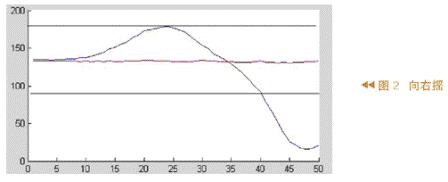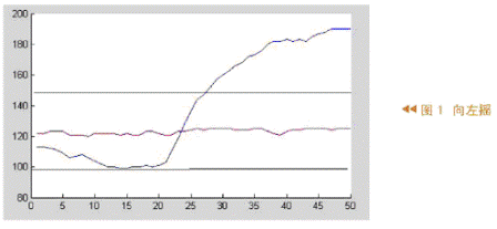 從圖1和圖2中可以看出,兩條黑線之間的數(shù)據(jù)很難斷定是哪個(gè)動(dòng)作產(chǎn)生的,因?yàn)閮蓚€(gè)動(dòng)作都可能產(chǎn)生這樣的值。所以,利用黑線之外的數(shù)據(jù)來(lái)判定是向右還是向左搖。因?yàn)閷?duì)于這兩個(gè)動(dòng)作,黑線之外的數(shù)據(jù)有明顯的差異,數(shù)據(jù)相差很多。對(duì)于圖1這些數(shù)據(jù)大于150,圖2中這些數(shù)據(jù)小于90。因此這些數(shù)據(jù)至少相差60,可以很容易地將向左、向右的兩個(gè)動(dòng)作區(qū)分開(kāi)。