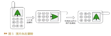 系統(tǒng)設(shè)計(jì)了六種動(dòng)作,他們分別是左搖、右搖、下?lián)u、上搖、圖片左轉(zhuǎn)、圖片右轉(zhuǎn)。圖4中的圖形象地說(shuō)明了其中的兩個(gè)動(dòng)作,其它的動(dòng)作與此類(lèi)似。