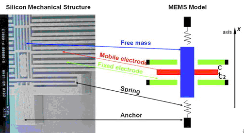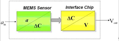 在電容式的結構中,當其中的質塊出現(xiàn)加速度運動時,就會產(chǎn)生電容量的差異變化(DC),此變化會傳送給另一顆接口芯片(Interface chip),由它來輸出可量測的電壓值。因此,一個3軸加速度計芯片中必須包含兩大單元,一是單純的機械性MEMS傳感器,它包含測量XY軸的區(qū)域及測量Z軸的區(qū)域,內部有成群移動的電子;另一則是標準的ASIC接口芯片,它會將電容變化轉換為電壓訊號輸出。