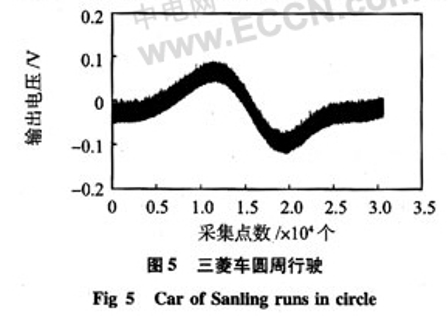 直線法和圓周法比較可以看出:圖5、圖3、圖4中的曲線變化規(guī)律明顯不同,曲線形狀變化較大是因?yàn)槟繕?biāo)運(yùn)動(dòng)方式不同,即影響磁場(chǎng)的方式不同,從而測(cè)得曲線有差別,圖5曲線中有個(gè)較大的峰值,是因?yàn)檐囋趫A周行駛時(shí),在采集信號(hào)期間車有一次通過(guò)傳感器敏感軸的正方向。另外,由于采集時(shí)間有限,所以,曲線沒(méi)有反映信號(hào)周期性變化,若采集時(shí)間達(dá)到2個(gè)周期,則會(huì)出現(xiàn)2個(gè)主峰。