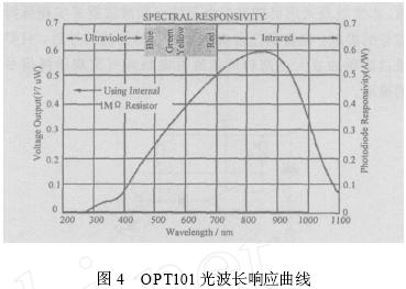 在本文中, 采用一種新型的光敏元件OPT101 , 該元件將感光部件和放大器集成在同一個芯片內(nèi)部, 這種集成化的設(shè)計(jì)方式有效地克服了后端運(yùn)算放大器空載電流輸出對光敏部件輸出電流的影響, 而且芯片輸出的電壓信號可以通過外部的精密電阻進(jìn)行調(diào)節(jié), 有利于芯片適應(yīng)整體的電路設(shè)計(jì), 同時(shí)芯片的集成化設(shè)計(jì)也能夠減小系統(tǒng)的功耗。