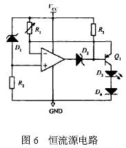 圖6 為恒流源電路, 在電路中R1 兩端的電壓值恒等于穩(wěn)壓二極管D1 的穩(wěn)壓值,因此流經(jīng)R1 的電流值恒定,控制使三極管Q1 處于放大狀態(tài), 那么流過發(fā)光二極管D3 的電流值恒定,因此發(fā)光二極管D3 能輸出穩(wěn)定光強(qiáng)的光。[page]