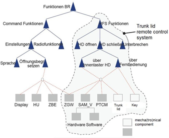 圖3是一個(gè)后備箱蓋的工作功能樹(shù)。在這里,打開(kāi)后備箱實(shí)際上需要激活兩個(gè)ECU裝置。其余的ECU用來(lái)執(zhí)行顯示和控制等功能。