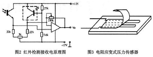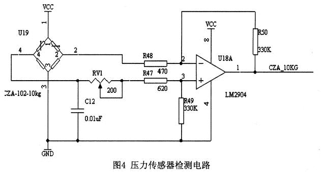 圖4為壓力傳感器的應(yīng)用電路圖,該電路采用的電橋構(gòu)成測(cè)量電壓,是一種具有較高靈敏度的測(cè)量方法。無(wú)差壓時(shí),電橋兩臂平等。差壓信號(hào)加到4個(gè)陶瓷壓敏電阻上,壓敏電阻的阻值隨差壓而變化,引起電橋失衡。電橋失衡引起電流的變化,通過(guò)運(yùn)放LM2904進(jìn)行電流的放大在后面接ADC0834模數(shù)轉(zhuǎn)換芯片,把模擬信號(hào)轉(zhuǎn)化為數(shù)字信號(hào),再傳輸至CPU進(jìn)行處理。