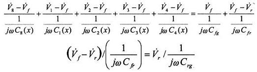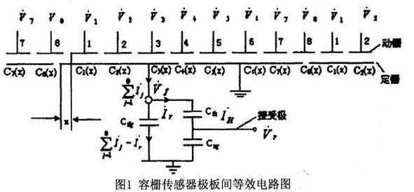 相應(yīng)的信號(hào)源全部落在這些電容上,同樣,對(duì)傳感器的輸出信號(hào)無(wú)影響。如果給容柵傳感器每組發(fā)射極板上所加的發(fā)射電壓V1~V8為8路頻率、幅值相同而相鄰小極板間相位相差為π/4的正弦交變電壓,則在發(fā)射極上有電壓Vf,在接收極上有電壓Vr。應(yīng)用交流電路理論及基爾霍夫電流定律,解讀圖l的等效電路,如下: