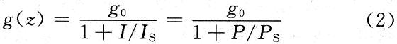式中:g0是由泵浦強度定的小信號增益系數(shù),由于增益飽和現(xiàn)象,隨著信號功率的增加,增益系數(shù)下降;Is,Ps分別為飽和光強和飽和光功率,是表明增益物質(zhì)特性的量,與摻雜系數(shù)、熒光時間和躍遷截面有關(guān)。