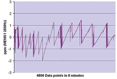 BAW振蕩器的圖表(此處不再列出,但在完整研究報(bào)告中可找到)為大多數(shù)人所熟知。對(duì)于相同的測試,典型的BAW振蕩器偏差低于±0.02ppm,這樣會(huì)在零偏差圖表線處形成一條直線。