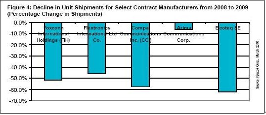 對于富士康、偉創(chuàng)力、仁寶通訊、華冠通訊和Elcoteq SE等重要廠商來說,2009年出貨量實際上大減了一半,突顯手機(jī)合同制造商面臨極大的困難。圖4所示為2008至2009年部分合同制造商出貨量下降百分比。