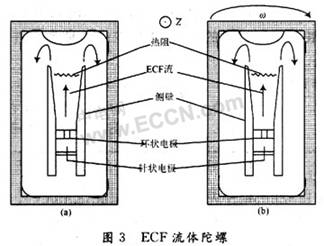 流體是一種新型的流體材料,當(dāng)在流體兩端的電極上加上幾千伏的電壓時(shí),ECF流體可以產(chǎn)生很強(qiáng)的流動(dòng),利用ECF流體的這種特性可以制作基于ECF的流體陀螺。由日本東京工業(yè)大學(xué)制作的這種流體陀螺如圖3所示,其基本原理如下:在容器內(nèi)部充滿ECF液體,當(dāng)在如圖3所示的電極上加上上千伏的電壓時(shí),便會(huì)產(chǎn)生很強(qiáng)的ECF液體沖擊流,并往圖3(a)所示方向流動(dòng)。