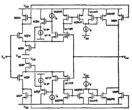 因此,這種緩沖器的工作過程可以這樣詳細(xì)描述如下:當(dāng)輸入信號Vin,在中部電源電壓區(qū),兩個(gè)輸入對MIP~M2P和MlN—M2N是有效的,M4P-M5P和M4N--M5N鏡像一個(gè)等于IB的電流到輸出支路。而且,電流IB的復(fù)制品通過晶體管MIPR(M1NR)和M2PR—M3PR(MlNR—M2NR)拷貝,給輸出支路底部的附加電路的電流源提供電流。因此,晶體管M4P和M5P(M4N和M5N)關(guān)斷,而且對輸出電流沒有任何貢獻(xiàn)。輸入信號接近VDD時(shí),PMOS輸入對關(guān)斷,而且反相輸入支路的復(fù)制品等等都關(guān)斷。MIPR--M3PR不對輸出支路的附加電路發(fā)送任何電流。這樣的話,M4PR和M5PR導(dǎo)通,從輸出支路吸收等于IB的電流,維持緩沖器是導(dǎo)通的。當(dāng)輸入信號Vin接近VSS時(shí),類似的情況也會發(fā)生。