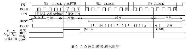 如圖 1示。ADS7843串行接口的一次完整操作需要 3× 8=24個 DCL K時鐘周期,前 8個脈沖接收 8位的命令,并在第 6個脈沖的上升沿開始 A / D轉(zhuǎn)換器進入采樣階段,從第 9個脈沖開始進入轉(zhuǎn)換階段,輸出12位采樣值,轉(zhuǎn)換結(jié)束進入空閑階段。直到 24個DCL K結(jié)束,CS置高電平,一次測量結(jié)束。如圖 2所示。此外,ADS7843還支持其他的工作方式,這里不再詳述。