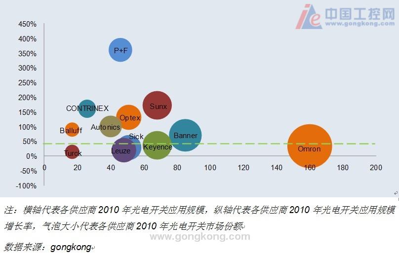 據gongkong《2011年中國離散傳感器市場研究報告》數據顯示,2010年離散傳感器市場迎來高速增長,市場規(guī)模達到34.5億人民幣,同比去年增長43.7%,其中光電開關和接近開關的增長幅度都超過了50%,編碼器增長幅度也超過40%,皆為2007年以來的最高水平。