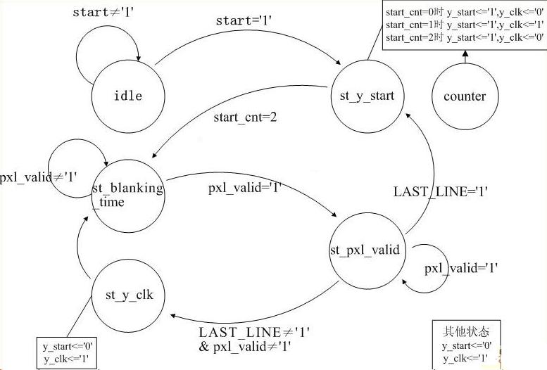 CMOS圖像傳感器結(jié)構(gòu)簡單,內(nèi)部集成度高,因此僅需很少的外部控制信號(hào)即可完成視頻圖像的采集輸出。系統(tǒng)工作過程如下:當(dāng)系統(tǒng)上電后,CPLD產(chǎn)生復(fù)位信號(hào)復(fù)位整個(gè)芯片到初始狀態(tài),然后對(duì)芯片進(jìn)行并行數(shù)據(jù)注入,向CMOS圖像傳感器的特殊寄存器寫入預(yù)定值,設(shè)置諸如像元積分時(shí)間,像素讀出行數(shù),輸出放大器增益等參數(shù)。隨后CPLD給CMOS芯片提供 ss_start信號(hào),標(biāo)志開始像素積分,ss_stop信號(hào)結(jié)束像素積分,隨后圖像傳感器即處于可讀出狀態(tài)。向CMOS發(fā)出y_start信號(hào)開始一幀圖像的讀出,發(fā)出y_clock信號(hào),開始一行圖像的讀出,當(dāng)CMOS圖像傳感器有像素信號(hào)輸出時(shí), pxl_valid引腳信號(hào)為高,此時(shí)CMOS圖像傳感器正在進(jìn)行一行圖像的輸出,當(dāng)pxl_valid變低時(shí),一行圖像輸出結(jié)束,CPLD再提供下一個(gè)y_clock信號(hào),啟動(dòng)CMOS進(jìn)行下一行圖像的讀出。當(dāng)一幀圖像的最后一行開始讀出時(shí),CMOS芯片的LAST_LINE引腳變高,標(biāo)志一幀圖像讀出的結(jié)束,CPLD再產(chǎn)生下一個(gè)ss_start信號(hào),開始下一幀圖像的讀出。這樣,CMOS就在CPLD的時(shí)序控制下,正常工作,循環(huán)讀出圖像。