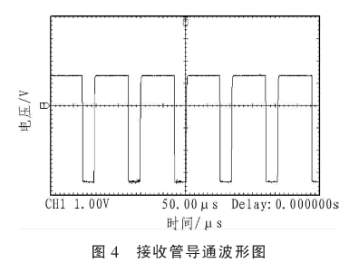 紅外線接收管選用HS0038型的紅外一體接收頭,該器件集成度高,能夠以小成本實(shí)現(xiàn)圖3所示功能。紅外線接收管需要接收38 kHz左右?guī)挼拿}沖波形,接收發(fā)射管只能接收間歇發(fā)射的紅外線,發(fā)射紅外線過于密集,接收管無法導(dǎo)通,需要予以注意。紅外線發(fā)射管發(fā)出38 kHz載波,將紅外線接收管導(dǎo)通。該波形頻率為1 kHz,周期內(nèi)高電平時(shí)間720μs,低電平時(shí)間280μs。當(dāng)有物體遮擋紅外線對射管時(shí),發(fā)射源被遮擋,紅外線接收管無法導(dǎo)通,輸出高電平。由此可以判斷是否有物體從紅外線對射管中間通過。紅外線接收管導(dǎo)通時(shí)的輸出波形如圖4所示。