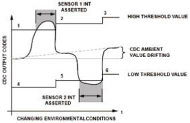 隨著環(huán)境條件的變化(例如,溫度或濕度上升),傳感器的環(huán)境參數(shù)(在用戶沒有與傳感器接觸期間,由CDC進(jìn)行測量)會發(fā)生漂移。為了進(jìn)行補(bǔ)償,需要動態(tài)改變高端和低端閾值電平,以確定有效的傳感器接觸。位置2、3、5、6處的參考電平進(jìn)行重新調(diào)整,以保持最佳的閾值參考電平,從而自動跟蹤和補(bǔ)償漂移誤差。