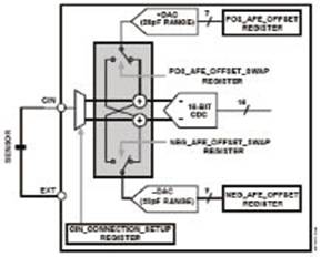 PCB還可能受到寄生電容的影響,這種電容最大可達(dá)20 pF,它會在電容觸摸傳感器視為受到按壓時,使閾值發(fā)生偏移,從而改變其靈敏度。為了對寄生電容進(jìn)行補(bǔ)償,可以采用對DAC編程的方法,以抵消CDC的輸入。對于各PCB來說,這種寄生電容是一致的,因此可以在制造PCB的時候進(jìn)行簡單的調(diào)整,這樣就不需要外部RC調(diào)諧元件,從而使材料、裝配和測試相關(guān)的成本最低。單獨(dú)調(diào)整每個傳感器的偏移,使設(shè)計者可以充分利用轉(zhuǎn)換器的分辨率(圖3)。