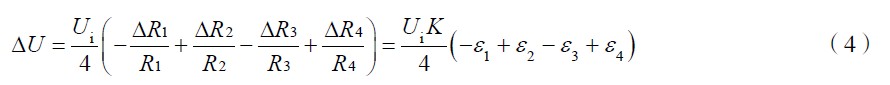 式(4)為電橋轉(zhuǎn)換原理的一般形式。ΔU 為電橋輸出電壓。作為全等臂電橋, ΔR1 = ΔR2 = ΔR 3= ΔR4 ,式(4)變?yōu)?Delta;U =UKε 。