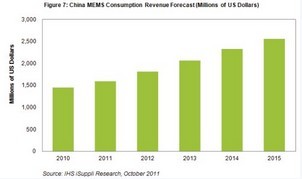 未來(lái)幾年,中國(guó)市場(chǎng)上增長(zhǎng)最快的MEMS領(lǐng)域?qū)⑹鞘謾C(jī)與消費(fèi)市場(chǎng)的麥克風(fēng)、加速計(jì)和陀螺儀。IHS公司預(yù)計(jì),2015年該市場(chǎng)的MEMS銷售額將達(dá)到13億美元,2011-2015年復(fù)合年度增長(zhǎng)率為21%。