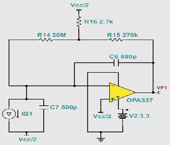 為了獲得更為實際的電路實施,我們選用了TI的OPA337.這款放大器擁有低輸入電壓和低輸入電流噪聲(請參見圖5),同時接受3V單極電源。圖6顯示了TI SPICE型仿真程序中這種電路的模型,即TINA-TI.