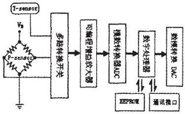 在溫度傳感器的輔助作用下通過信號(hào)轉(zhuǎn)換開關(guān)分時(shí)讀取壓力與溫度的數(shù)值,通過可編程增益放大器將微弱信號(hào)放大,再經(jīng)過ADC量化傳感器的信號(hào)進(jìn)入數(shù)字處理器計(jì)算當(dāng)前溫度和壓力下的補(bǔ)償后壓力輸出給數(shù)模轉(zhuǎn)換DAC輸出模擬信號(hào)。而溫度補(bǔ)償則可以通過通訊接口將參數(shù)寫入EEPROM供數(shù)字處理器計(jì)算時(shí)調(diào)用。如此多的功能部件均可集成制作在一塊單一芯片上,使得ASIC電路很容易和MEMS技術(shù)制作的壓力敏感芯片封裝在一個(gè)小巧的殼體中。