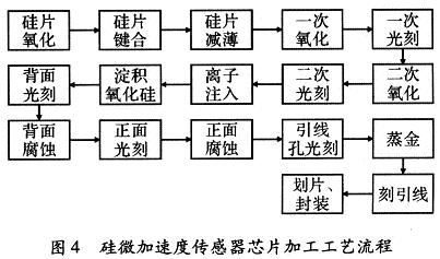 壓阻式傳感器的懸臂梁常采用CVD工藝在硅片上外延生長一層外延層刻蝕而成,文中試用鍵合工藝制造壓阻式加速度傳感器。采用鍵合工藝優(yōu)點(diǎn)是能得到高質(zhì)量的外延層,且懸臂梁的厚度通過硅片減薄工藝易于得到保證,精細(xì)的硅片單面研磨,厚度誤差可以控制在0.5 μm以內(nèi);且不需要電化學(xué)自停止腐蝕,依靠EPW腐蝕液對SiO2的腐蝕速度極慢,使得腐蝕過程停止在SiO2層上,從而保證了硅片減薄后的厚度即為彈性梁的厚度。制作的傳感器芯片尺寸3 mm×5 mm,封裝在陶瓷管殼中。選n型硅片,晶向(100),直徑為50mm,厚度為300μm,電阻率為5~12 Ω·cm。傳感器芯片加工工藝流程,如圖4所示。