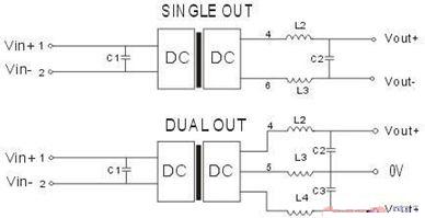 3、 由于DC/DC電源模塊是采用開關(guān)振蕩電路來(lái)實(shí)現(xiàn)的,其自身也會(huì)產(chǎn)生共模、差模噪聲的干擾,對(duì)于對(duì)紋波噪聲要求較高的場(chǎng)合可在DC/DC電源模塊的輸出端外接無(wú)源LC濾波網(wǎng)絡(luò)或RC(損耗較大),以進(jìn)一步降低電源紋波噪聲,但是要注意L自身諧振頻率要遠(yuǎn)高于模塊的開關(guān)頻率,允許通過(guò)的電流值最好在模塊輸入電流的兩倍以上,內(nèi)阻要小,以降低直流損耗。具體可參考下圖: