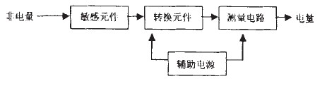 傳感器是將各種非電量(包括物理量、化學(xué)量、生物量等)按一定規(guī)律轉(zhuǎn)換成便于處理和傳輸?shù)牧硪环N物理量 (一般為電量)的裝置。傳感器一般由敏感元件、轉(zhuǎn)換元件和測(cè)量電路三部分組成,有時(shí)還需外加輔助電源。 傳感器方框圖如圖1所示。