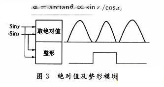 從原理上可以看出,該細分模塊的技術(shù)關(guān)鍵是比較器整形產(chǎn)生的卦限信號和A/D模塊產(chǎn)生的地址信號必須同步,這是能否正確細分的關(guān)鍵。因此,在電路設(shè)計過程中,比較器的滯后及其抗干擾能力是必須考慮和解決的問題。在抗干擾方面,采用差分放大,可以有效地抑制共模干擾??紤]其滯后問題,采用整形電路與取絕對值電路分離,可以通過調(diào)節(jié)各個運放的直流參數(shù),使得卦限信號與絕對值信號能夠近似同步,否則,產(chǎn)生的細分方波將會在過零處變得混亂。如圖3所示,對其中sinx信號取絕對值及整形,這樣一來,既方便了調(diào)試,也避免了干擾及比較器的滯后問題。