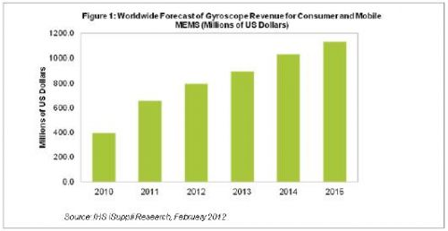 據(jù)IHS iSuppli公司的MEMS市場追蹤報告,由于蘋果iPhone和iPad去年第四季度創(chuàng)出最高銷量紀錄,2011年陀螺儀成為消費與移動MEMS領域中的創(chuàng)收大戶。